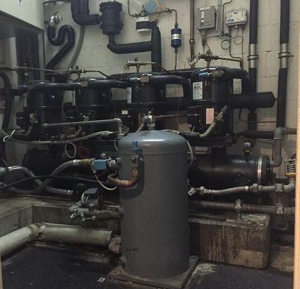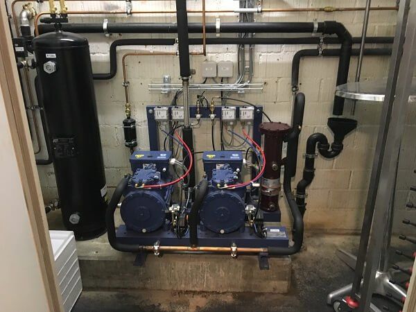 Neue Pluskühlanlage, ausgelegt als Sammleraggregat mit Wärmerückgewinnung (Vollkondensation) zur Erwärmung von Brauchwarmwasser BWW.