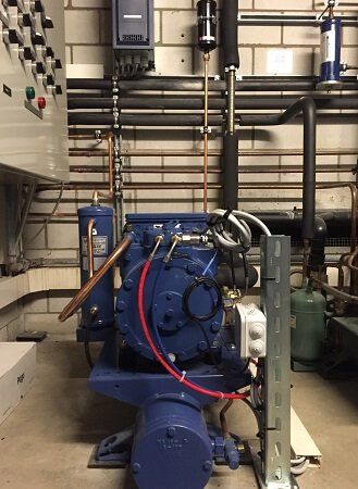 Neue Tiefkühlanlage, ausgelegt als Sammleraggregat mit Wärmerückgewinnung und stufenlose Leistungsregulierung mit Frequenzumrichter.