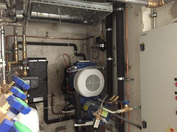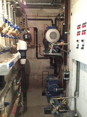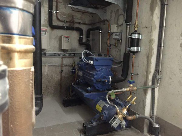 Neue Pluskühlanlage, ausgelegt als wassergekühltes Sammleraggregat mit Wärmerückgewinnung (Vollkondensation) zur Erwärmung von Brauchwarmwasser. Stufenlose Leistungsregulierung mit Frequenzumrichter.